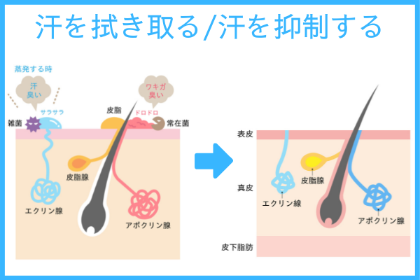 汗臭の原因から考えると、汗を放置してしまうとニオイが発生してしまうとわかりました。そのため、考えられる対策は2つです。