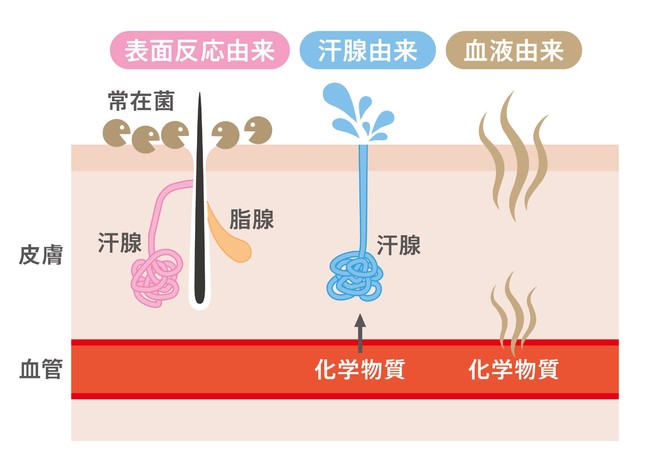 エクリン腺から出る汗は体温調節が目的で分泌されていて、本来は無味無臭です。しかし、細菌が汗に混じった皮脂やアカを分解すると、悪臭物質に変化するわけです。その悪臭物質というのが酢酸、イソ吉草酸、アンモニアなどが挙げられます。