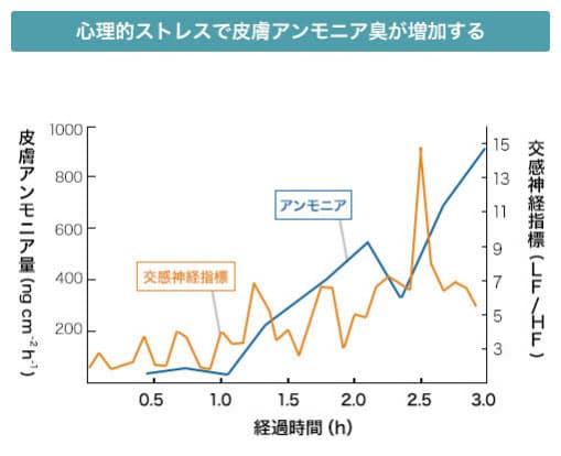 研究では交感神経が刺激されると、アンモニア濃度も上がることが確認されています。つまり、ストレスが交感神経を刺激して、アンモニア濃度が上がるというメカニズムですね。ストレス臭が他と違うのは、血液からアンモニアが出てくるので、皮膚を清潔にしていても関係がない点です。