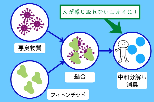 というのも、フィトンチッドは悪臭物質とくっつくことで、中和分解して人が感じ取れないニオイにします。
