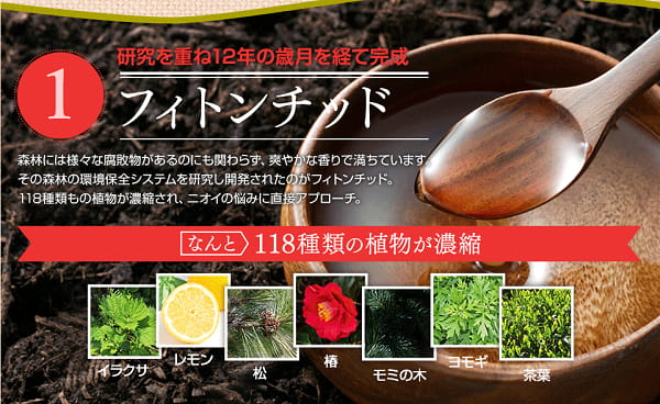 フィトンチッドとは、自然由来の消臭成分のことです。よく「森の空気は美味しい」と言いますが、本来は動物の死骸や糞などでクサイはず。