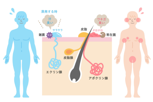一方でアポクリン腺から出る汗は水分だけではなく、脂肪酸やタンパク質などが多く含まれています。汗が出て放置していると、雑菌が汗に含まれる物質を分解して、刺激臭に変化するのです。